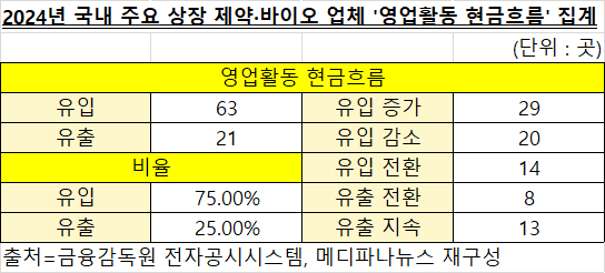 광동제약, 코오롱생명과학, 현대약품, 신풍제약, 조아제약, 경동제약, 명문제약, 동성제약, 삼성제약 등 13개 업체는 2023년에 이어 지난해까지 영업활동 현금흐름 유출이 이어진 기업이다.