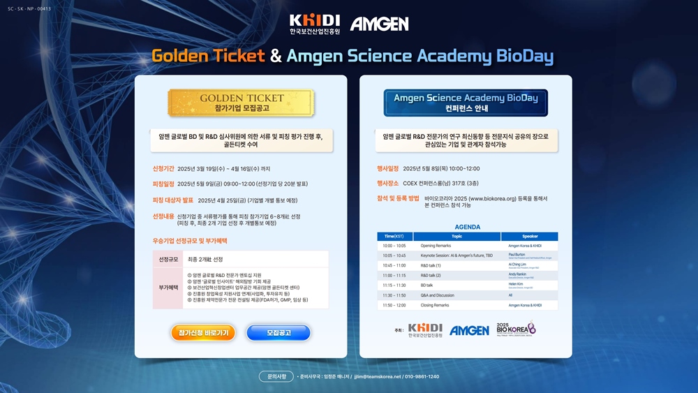 서류평가를 통해 선정된 기업들은 '바이오코리아 2025' 기간 중 진행되는 '골든티켓 피칭 이벤트(Pitching event)'에서 암젠 글로벌 임원에게 직접 기술을 발표하게 된다.