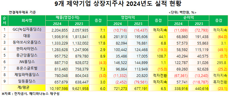 메디파나뉴스가 9개 제약기업 상장 지주사들이 최근 공시한 2024년도 감사보고서를 집계한 자료에 따르면 매출(영업수익)은 평균 6.0% 성장했고, 영업이익은 6.5%, 당기순이익은 23.1% 급감한 성적표를 내놓았다.