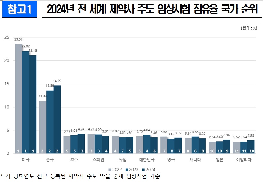 분석에 따르면, 2024년 전 세계적으로 수행된 임상시험은 총 4667건으로 전년 대비 4.4% 증가했다. 하지만 한국은 임상시험 건수와 점유율이 모두 줄어 전체의 3.46%를 차지하며 6위에 머물렀다. 이는 2023년 4위(점유율 4.04%)에서 두 계단 떨어진 성적이다.