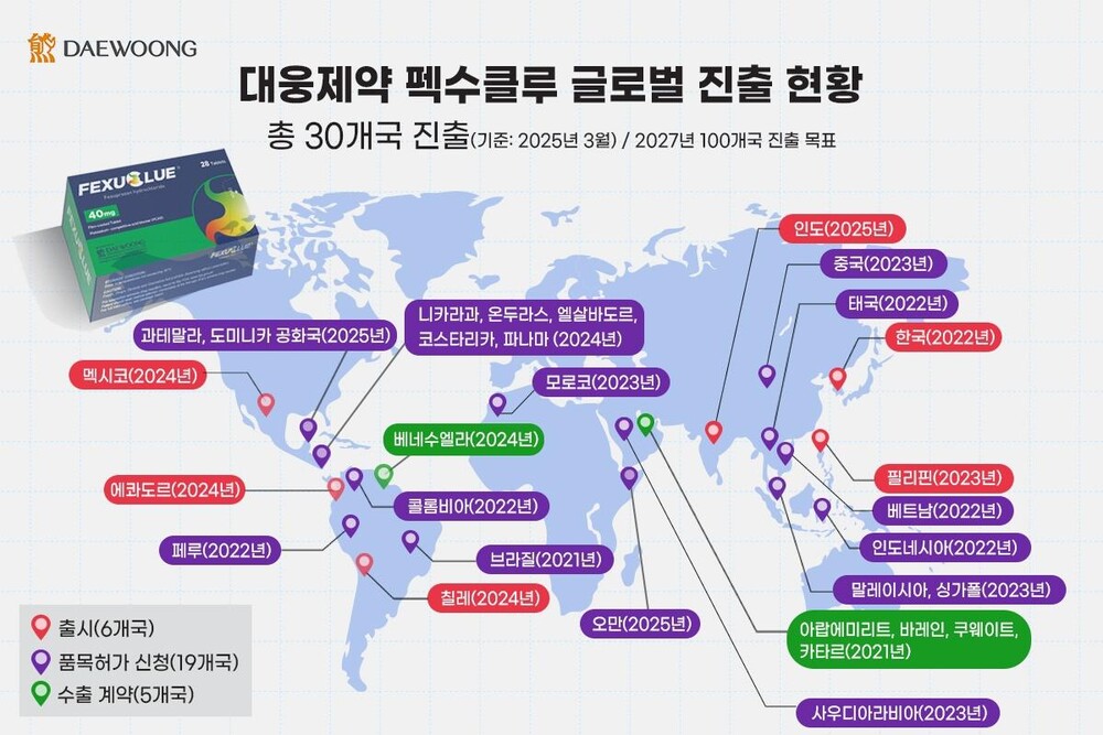 한편, 펙수클루는 출시 3년 차인 지난해 연매출 1000억 원을 돌파하며 블록버스터 의약품으로 자리매김했다. 이번 인도 출시로 한국, 멕시코, 칠레, 에콰도르, 필리핀 등 6개국에서 판매하게 됐으며, 이 외에도 19개국에서 품목허가를 신청했고, 5개국과 수출 계약을 체결해 총 30개국에 진출한 상태다. 대웅제약은 2027년까지 100개국 진출을 목표로 글로벌 확장에 박차를 가하고 있다.
