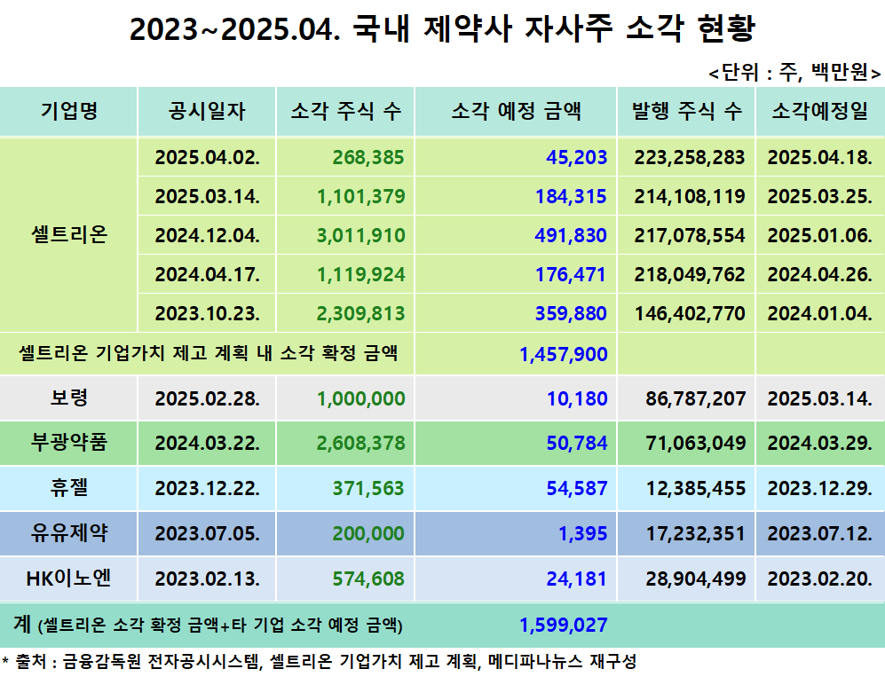 셀트리온은 2023년부터 5번의 자사주 소각 계획을 밝혔으며, 보령·부광약품·휴젤·유유제약·HK이노엔 등은 각 1번씩 자사주 소각을 시행했다.
