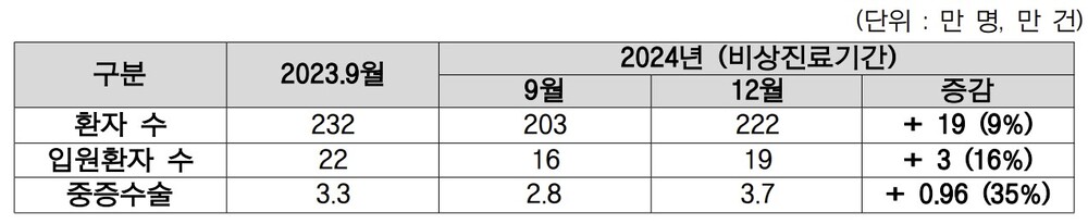 먼저 중증수술, 중증응급·소아 등 적합질환 환자 비중이 '24.1월 44.8%에서 '25.1월 52%로 7.2%p 증가했다. 또한, 비상진료기간 감소했던 진료량은 지원사업 시작 이후 중증수술·입원 등 중증 중심으로 역량을 회복하고 있다.