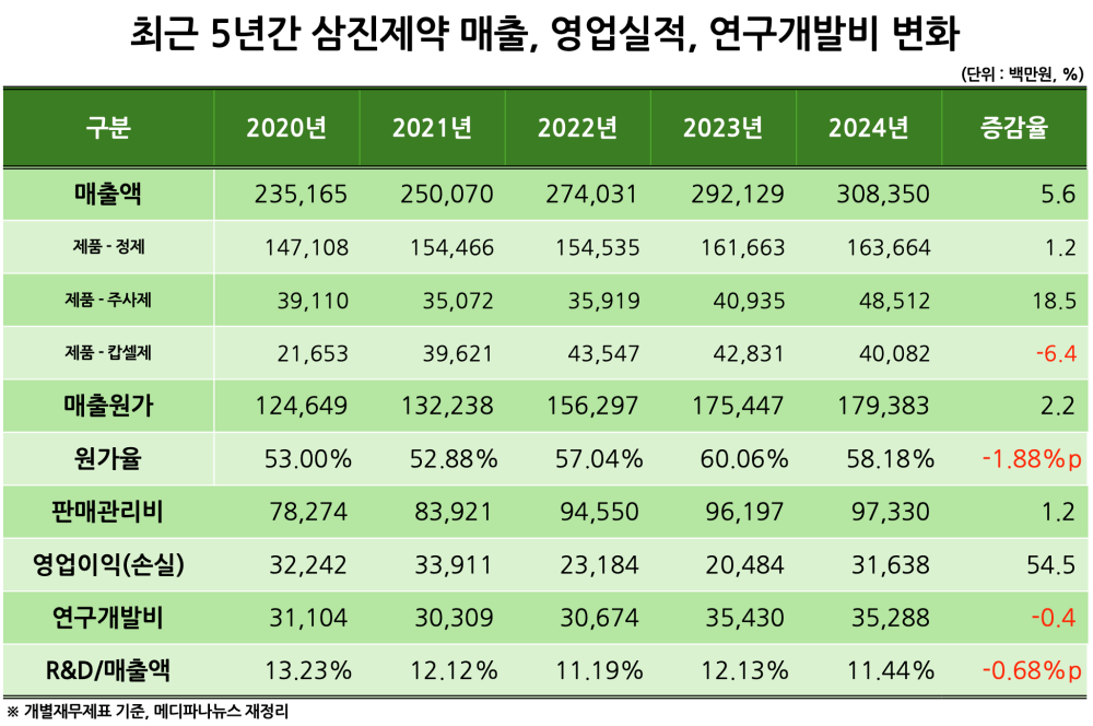 실제 삼진제약은 지난해 한 해 동안 총 353억원의 연구개발비를 집행했다. 이는 전년과 비슷한 수준이며, 매출 대비 연구개발비 비중은 11.44%로, 전년 대비 0.68%p 감소했다.