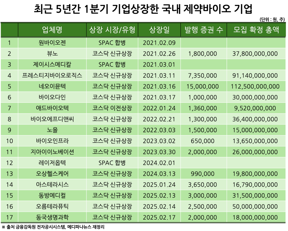 11일 메디파나뉴스가 금융감독원 전자공시시스템을 바탕으로 분석한 결과, 올해 1분기 IPO에 나선 제약바이오사는 ▲아스테라시스(1월 24일) ▲동방메디컬(2월 13일) ▲오름테라퓨틱(2월 14일) ▲동국생명과학(2월 17일) 등 총 4개사로, 모두 코스닥에 신규 상장됐다.