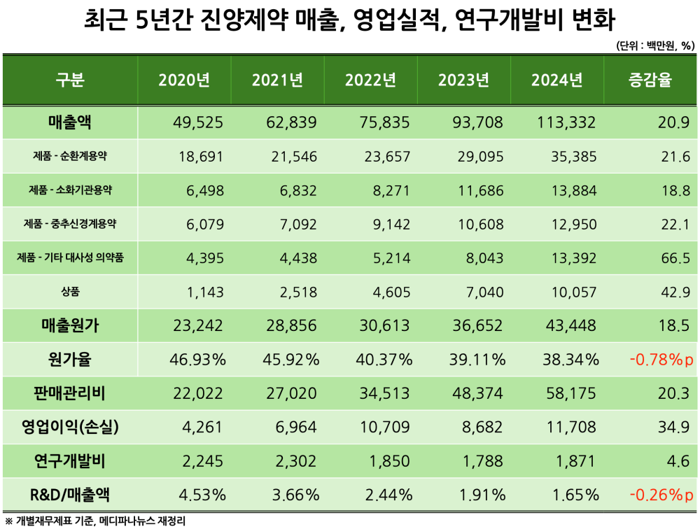 14일 금융감독원 전자공시시스템에 따르면 진양제약은 2024년 개별재무제표 기준 매출 1133억원, 영업이익 117억원, 순이익 297억원을 기록했다. 매출은 전년 대비 20.9%, 영업이익은 34.9% 증가했으며, 순이익은 세 배 가까이 급증했다. 코로나19 여파를 겪은 2020년 이후 매출은 매년 꾸준히 증가해 5년간 약 129% 성장했다.