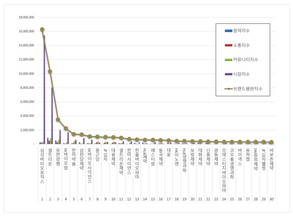 브랜드에 대한 평판지수는 브랜드에 대한 소비자들의 활동 빅데이터를 참여가치, 소통가치, 소셜가치, 시장가치, 재무가치로 나누게 된다. 제약 상장기업 브랜드 평판조사에서는 참여지수와 소통지수, 커뮤니티지수, 시장지수로 분석했다.