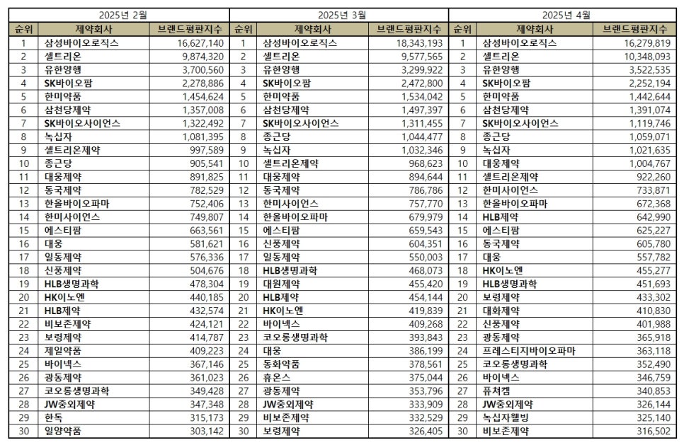 2025년 4월 제약 상장기업 브랜드평판 30위 순위는 삼성바이오로직스, 셀트리온, 유한양행, SK바이오팜, 한미약품, 삼천당제약, SK바이오사이언스, 종근당, 녹십자, 대웅제약, 셀트리온제약, 한미사이언스, 한올바이오파마, HLB제약, 에스티팜, 동국제약, 대웅, HK이노엔, HLB생명과학, 보령제약, 대화제약, 신풍제약, 광동제약, 프레스티지바이오파마, 코오롱생명과학, 바이넥스, 퓨쳐켐, JW중외제약, 녹십자웰빙, 비보존제약 순으로 분석됐다.