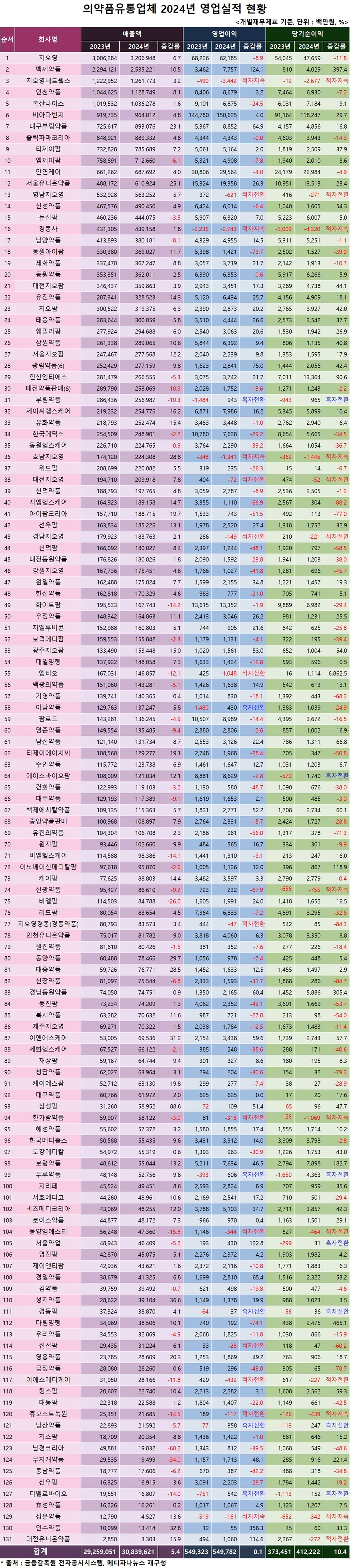 지오영, 백제약품, 지오영네트웍스, 인천약품, 복산나이스, 비아다빈치 등 1위부터 6위, 그리고 9위인 티제이팜은 2023년과 순위가 동일했다.