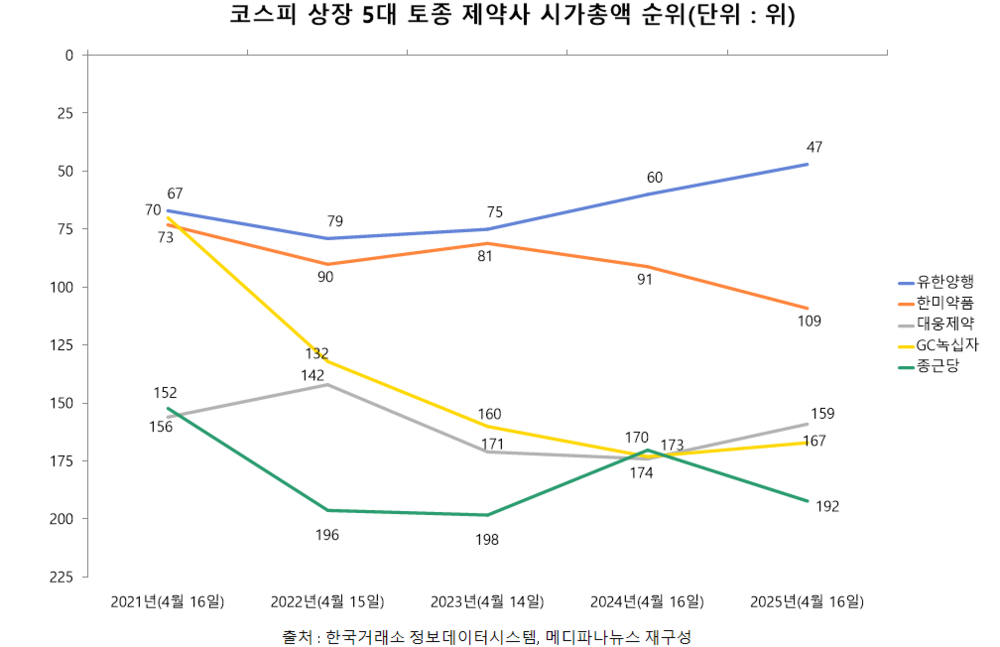 비교 범위를 5년으로 넓히는 경우, 시가총액 순위가 상승한 업체는 유한양행뿐이다. GC녹십자·종근당·한미약품·대웅제약은 기업별 이슈에 따라 시가총액이 감소하며, 순위도 하락했다.