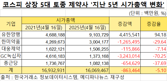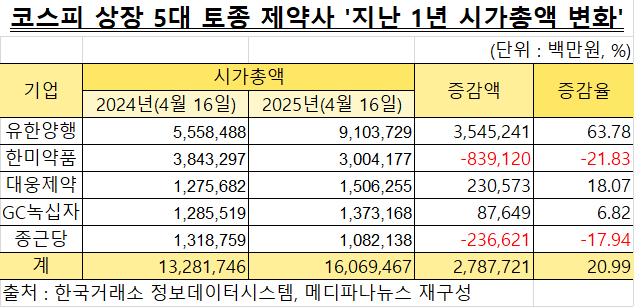 국내 토종 상위 제약사 5개 기업 시가총액 변화는 순위 변동과 다르지 않다. 유한양행 시가총액은 2021년 4월 16일 4조6881억원에서 지난 16일 9조1037억원으로 94.18%(4조4155억원) 증가했다.