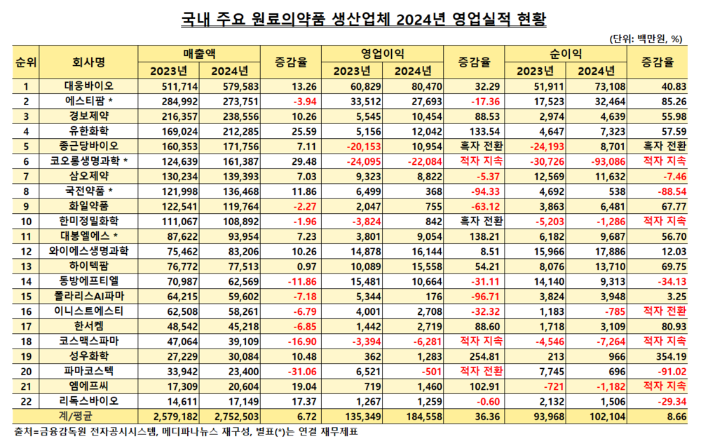 국내 주요 원료의약품 생산업체 22곳 中 절반, 순이익↑…1개 업체는 흑자 전환