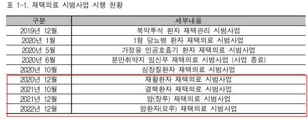 이들 사업은 길게는 5년, 짧게는 3년차에 접어든 시범사업으로, 병원급 이상 의료기관에서 시행하고 있다. 퇴원 후 집에서도 의료진에게 교육 및 상담 등을 받을 수 있다는 점에서 긍정적인 평가도 있지만 비대면이라는 한계가 있는 만큼 실효를 높이기 위해서는 방문 진료의 필요성이 요구되고 있다.