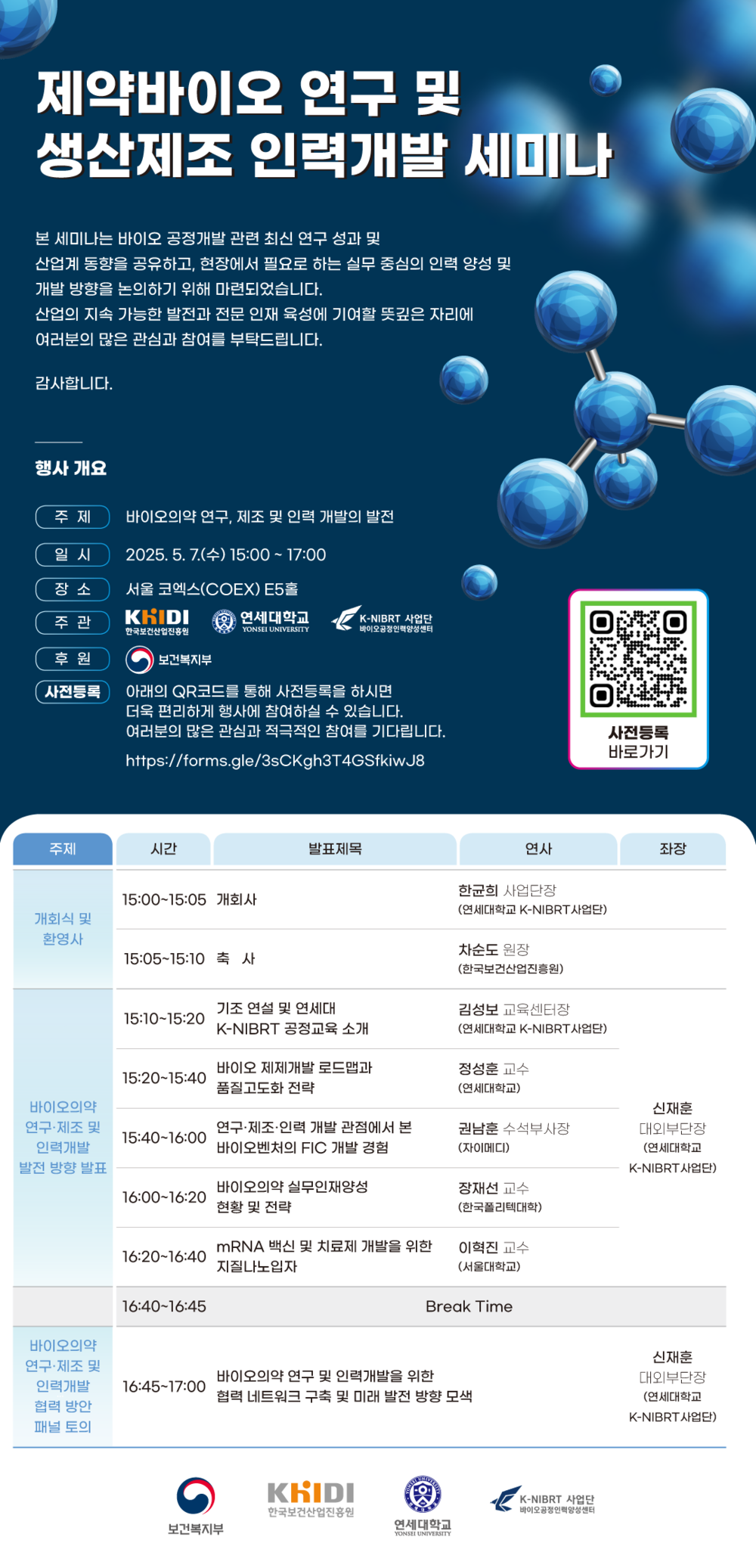 세미나는 보산진과 연세대학교 K-NIBRT사업단이공동주관하며, 제약바이오산업의 인재 수급 문제를 교육, 연구, 산업 관점에서 통합적으로 바라보고 해법을 제시하고자 한다.