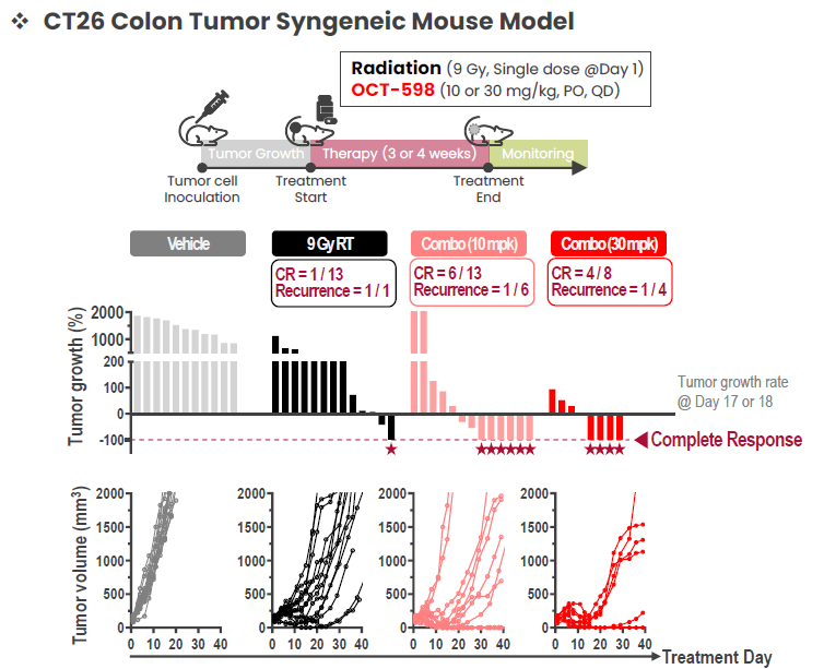 EP2/4 이중 저해제인 OCT-598은 지난 2023년 AACR학회 발표를 통해 마우스 폐암 모델의 표준치료법 병용 투여 시 모든 마우스 개체에서 종양이 완전 관해 되는 항암효과를 공개한 바 있다.