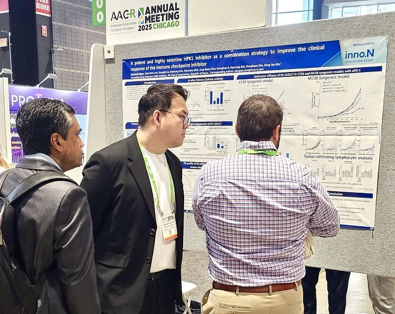 이번 학회에서 HK이노엔은 대장암 동종이식모델(syngeneic models)을 대상으로 한 시험에서 IN-122517이 항체면역항암제(anti-PD-1) 단독요법 대비 높은 항암 효능을 보였으며, 병용투여 시 종양이 완전관해에 이르렀고, 투여 중단 후에도 지속적인 면역 기억반응을 나타냈다고 발표했다. 현재 IN-122517은 2026년 임상시험계획(IND) 신청을 목표로 개발 중이다.