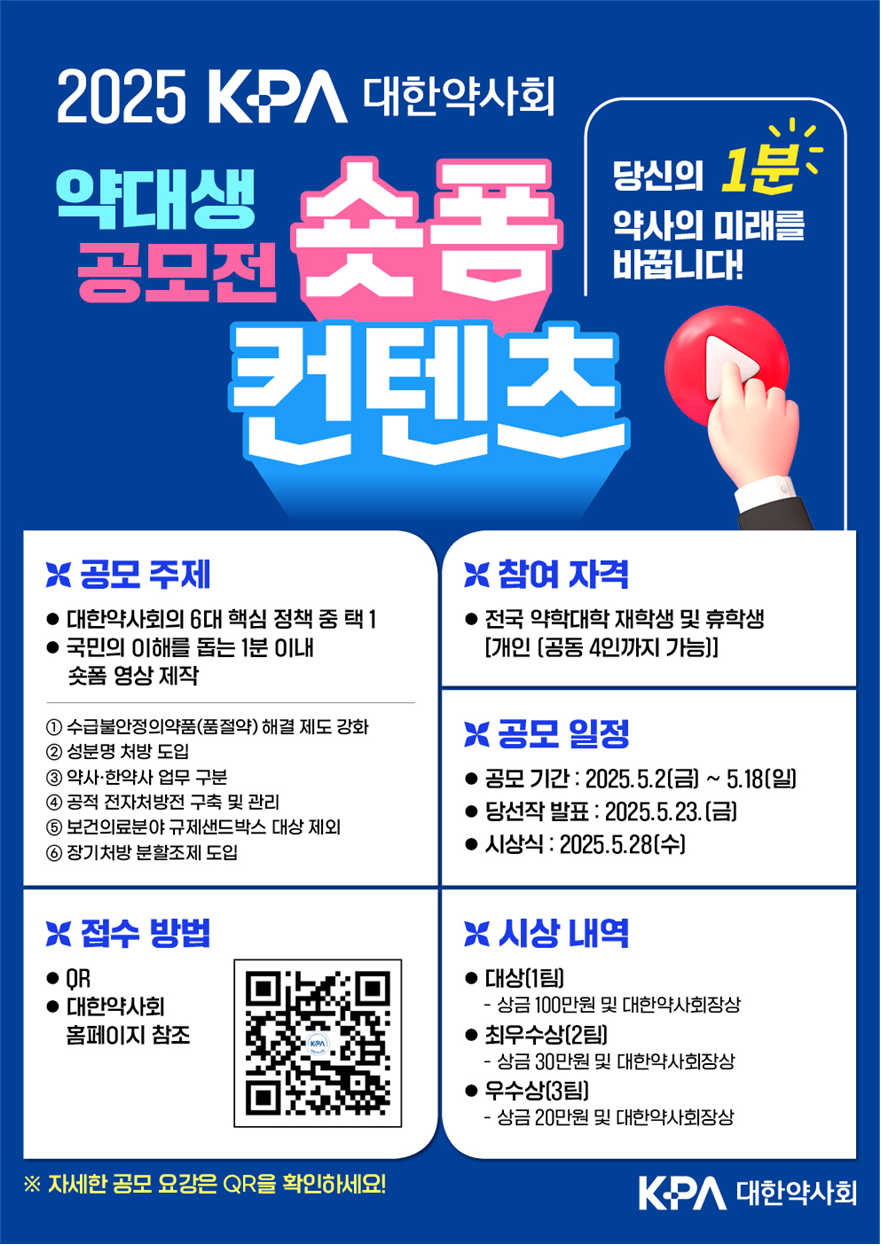 심사를 통해 ▲대상 1팀(상금 100만원) ▲최우수상 2팀(각 30만원) ▲우수상 3팀(각 20만원)을 선정하고, 수상자 전원에게 대한약사회장상을 수여한다. 당선작에 대해서는 향후 대한약사회 공식 유튜브 및 SNS 채널을 통해 홍보 및 교육 콘텐츠로 활용할 계획이다.