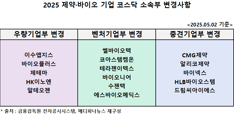 우량 또는 벤처기업부에서 중견기업부로 소속부가 변경된 기업은 CMG제약, 알리코제약, 바이넥스, HLB바이오스템, 드림씨아이에스 등 5개사다.
