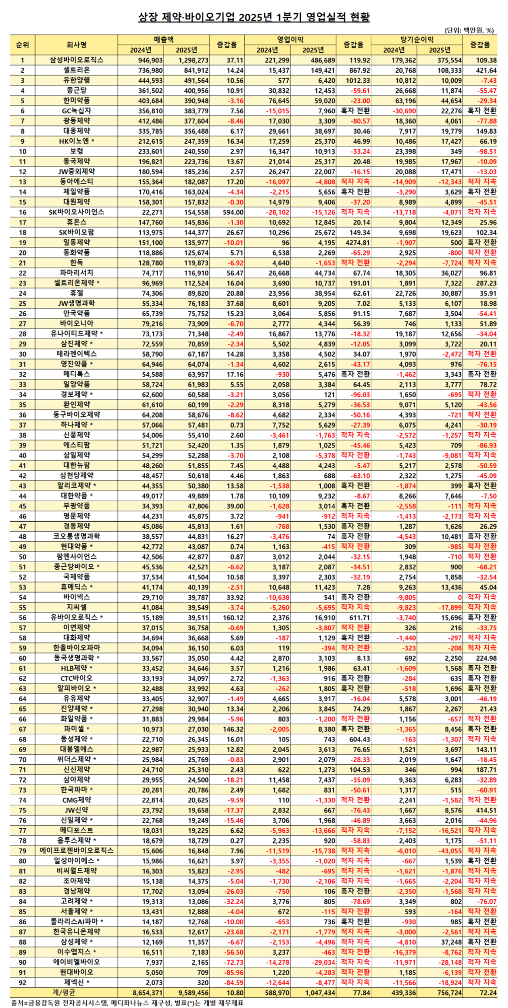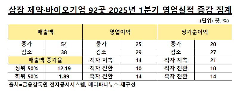 공시 자료에 따르면, 영업이익이 증가·감소한 기업은 각각 25곳, 29곳이다. 상장 제약·바이오 기업 92곳 가운데 14곳은 흑자 전환했으며, 10곳은 적자로 돌아섰다. 나머지 14곳은 지난해에 이어 적자를 지속했다.