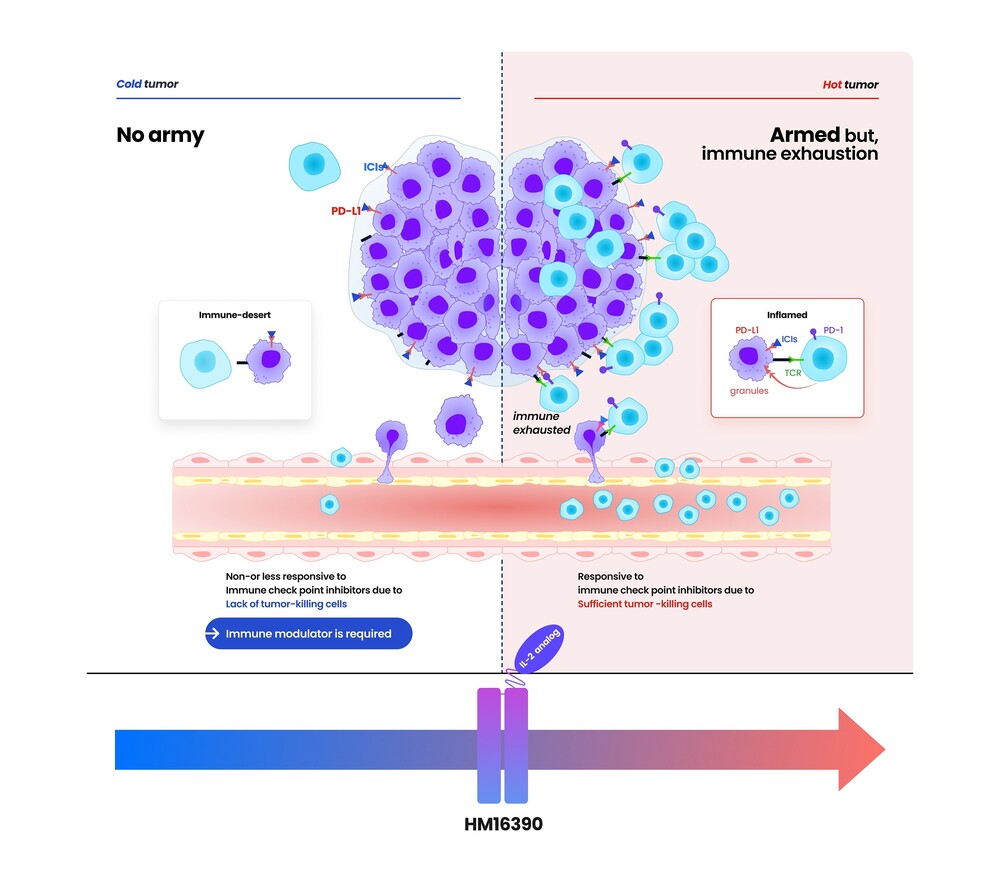 HM16390은 면역세포의 분화와 증식을 조절하는 'IL-2(인터루킨-2)'를 차별화된 전략으로 새롭게 디자인한 차세대 IL-2 변이체다. HM16390은 T 세포의 증식 및 활성화를 유도하는 기전으로, 종양미세환경에서 면역관문억제제에 반응하는 종양침윤림프구(Tumor-Infiltrating Lymphocytes, TIL)의 수를 증가시켜 면역원성이 낮은 'cold tumor'를 면역원성이 높은 'hot tumor'로 전환, 항종양 효과를 극대화하도록 설계됐다.