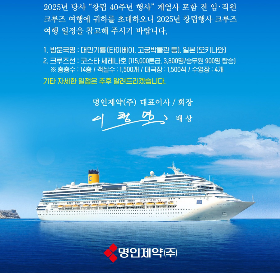 이번 크루즈 여행은 명인제약 이행명 회장이 조금은 특별한 창립 40주년을 위해 오랜기간 직접 기획하고 추진해 온 것으로 최근 직장인 커뮤니티에 사전공지 내용이 공유되는 등 주목을 받기도 했다.