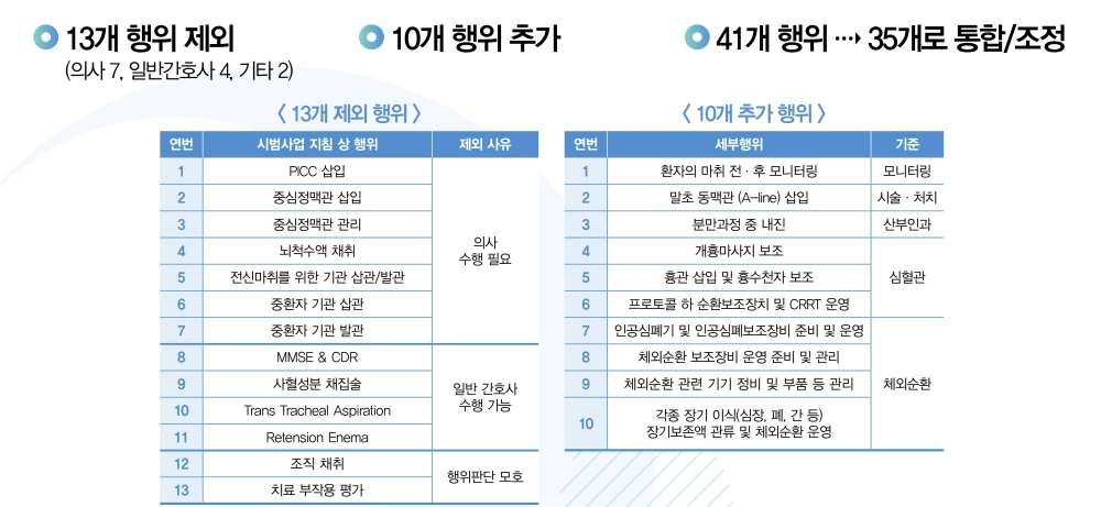 진료지원업무 범위는 기존 시범사업 54개 행위에서 45개 행위로 통합·조정된다. 의사가 수행해야 하거나 일반 간호사가 수행 가능한 업무, 행위가 모호한 업무 등 13개를 제외하고 새로운 업무 10개를 추가한 후 조정통합한 결과다.