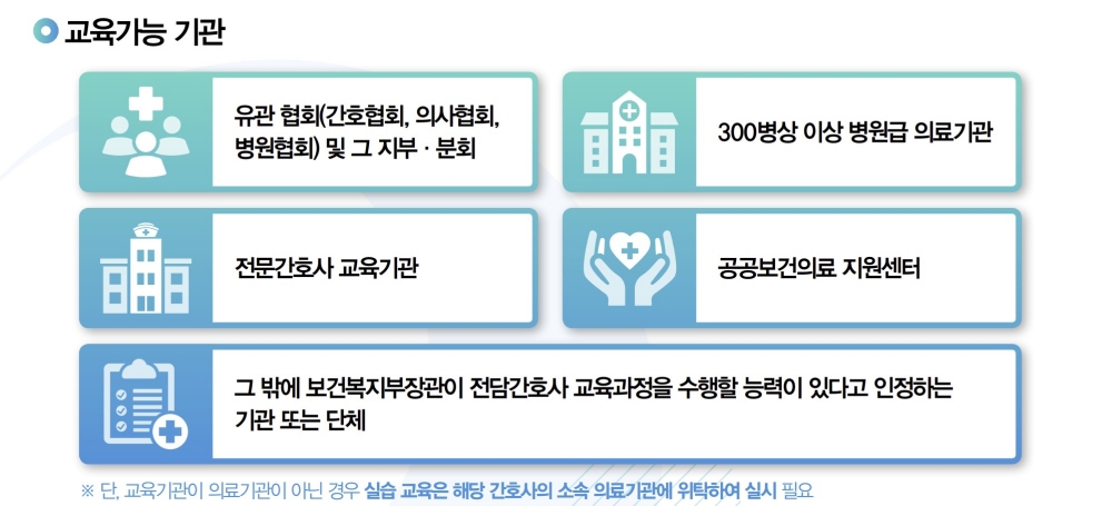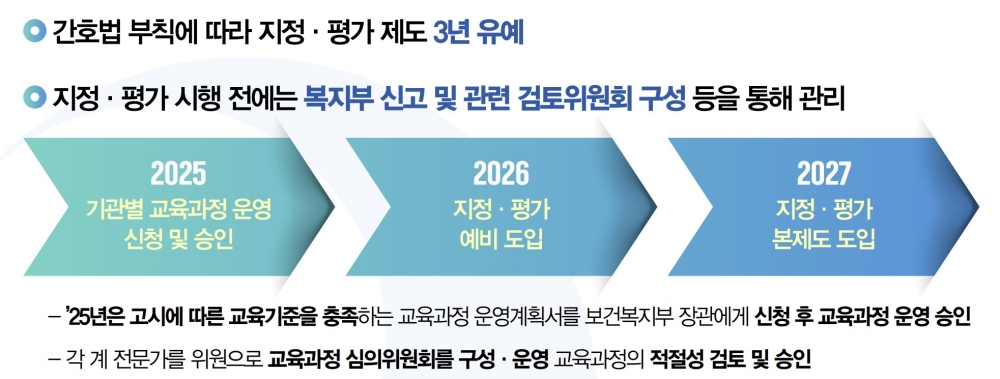 교육기관은 대한간호협회, 대한의사협회, 대한병원협회 등 의료인 단체와 300병상 이상 종합병원, 전문 간호사 교육기관, 공공보건의료 지원센터 등에서 지정된다. 지정 평가 제도는 간호법 부칙에 따라 2027년까지 3년 유예가 이뤄진다. 이에 따라 올해는 복지부 신고 및 승인으로 운영되고, 내년 예비도입 후 2027년 본제도 도입이 추진된다.