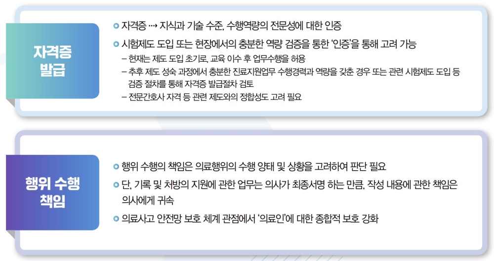 이어 "그렇기에 제도 도입 초기에는 현 업무 수행을 허용하는 정도로 하되, 제도 성숙기에서 경력과 역량을 갖춘 경우에 자격증을 발급하는 방안을 고민할 것"이라며 "기존 전문간호사 자격증 제도와의 정합성 부분에서도 고려할 부분들이 있는데, 향후 어떤 방향으로 나아가야 될 지 신속하게 고민하고 결정해야겠다고 생각하고 있다"고 덧붙였다.