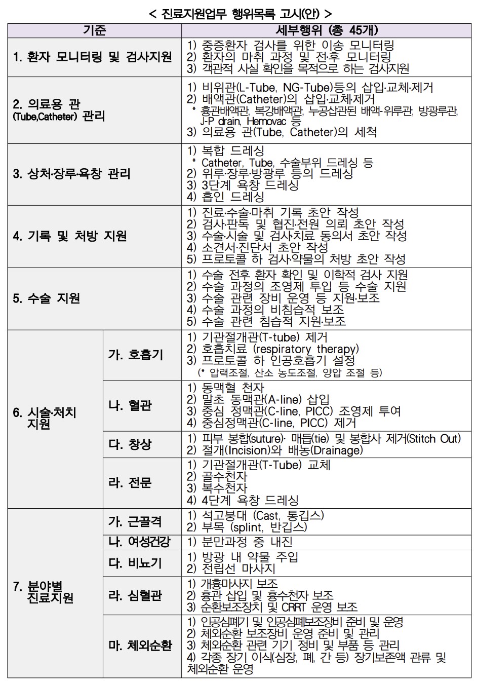 45개 업무는 총 7개 분야로 구성되며, '진료지원업무 행위목록 고시'를 통해 세부적으로 제시된다. 이 중 4개 분야는 공통 교육, 수술·시술·처치 등 3개 분야는 심화 교육 후 직무 수행이 가능하다.
