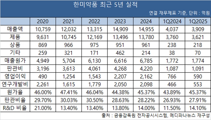 이 같은 제품 비중 상승은 전문의약품이 견인하고 있다. 최근 5년간 매출은 2020년 1조759억원에서 2021년 1조2032억원, 2022년 1조3315억원, 2023년 1조4909억원, 지난해 1조4955억원 등 꾸준히 상승했다는 점을 감안하면 제품 매출이 외형 성장을 견인하고 있다는 의미다.