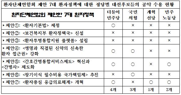 환자단체연합회가 제안한 7대 환자정책은 ▲환자기본법 제정 ▲신약 접근권 보장 ▲간호간병통합서비스 혁신 및 간병사 제도화 ▲응급의료체계 개편 ▲희귀난치질환 지원 확대 ▲장기이식 필수비용 국가책임제 ▲환자단체의 정책참여 확대 등이다.