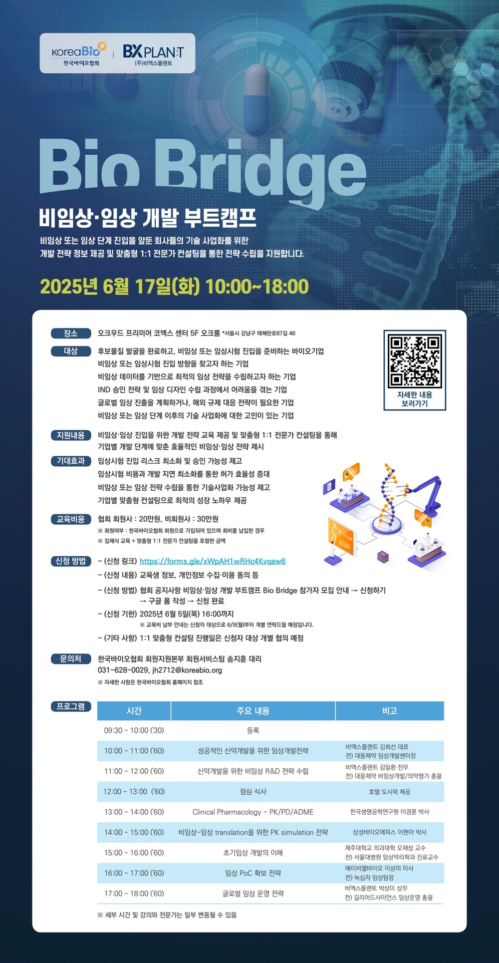 한국바이오협회 박수정 회원지원본부장은 "Bio Bridge 프로그램은 바이오 기업이 초기 비임상 단계부터 임상 진입, 나아가 기술사업화까지 전주기에 걸쳐 직면하는 전략적 과제를 체계적으로 지원하고자 기획됐다"며 "전문가 중심의 실무 교육과 기업 맞춤형 컨설팅을 통해, 보다 효율적이고 성공가능성 높은 개발 전략 수립을 돕는 것이 이번 프로그램의 핵심 목표"라고 밝혔다.