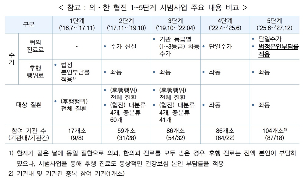 현행 건강보험에서 같은 날에 동일 질환으로 다른 의료기관에서 진료를 받을 때 후행 진료는 전액 본인이 부담해야 하나, '의·한 협진 시범사업 참여기관'에서 협진 모형에 따라 의과 및 한의과 진료를 받는 경우 후행 진료(전체질환 대상)에 대해 통상적인 건강보험 본인 부담률을 적용한다.