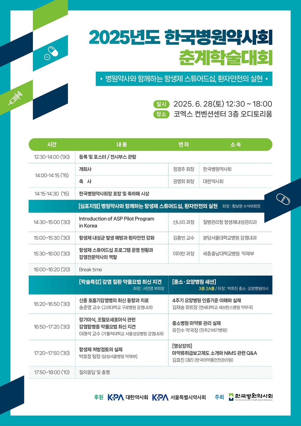 병원약사회는 이번 주제에 맞는 심포지엄과 학술특강을 마련해 ASP 운영 현황과 감염전문약사의 실질적인 역할을 조명하고, 감염 질환의 최신 약물요법에 대한 이해를 돕고자 한다.