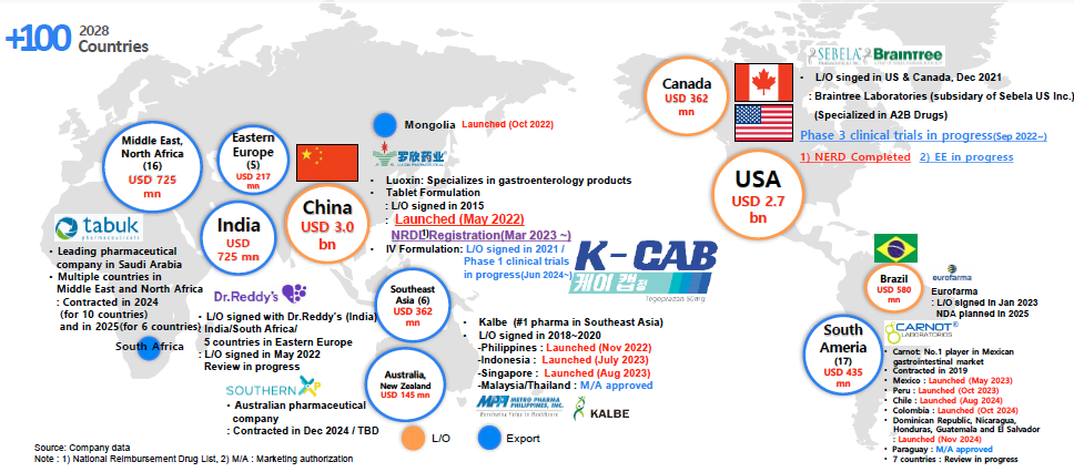 K-CAB은 현재 미국, 중국을 포함한 53개국에 기술이전이 완료됐으며, 이 중 18개국에서 실제로 출시됐다. 중국에서는 2022년 출시 후 2023년 국가의약보험목록(NRDL)에 등재되며 전국 31개 성으로 유통망이 확대됐다. 미국에서는 세벨라(Sebela)와의 파트너십을 통해 3상 임상이 진행 중이다. HK이노엔은 2028년까지 100개국 진출을 목표로 글로벌 확장을 가속화하고 있다.