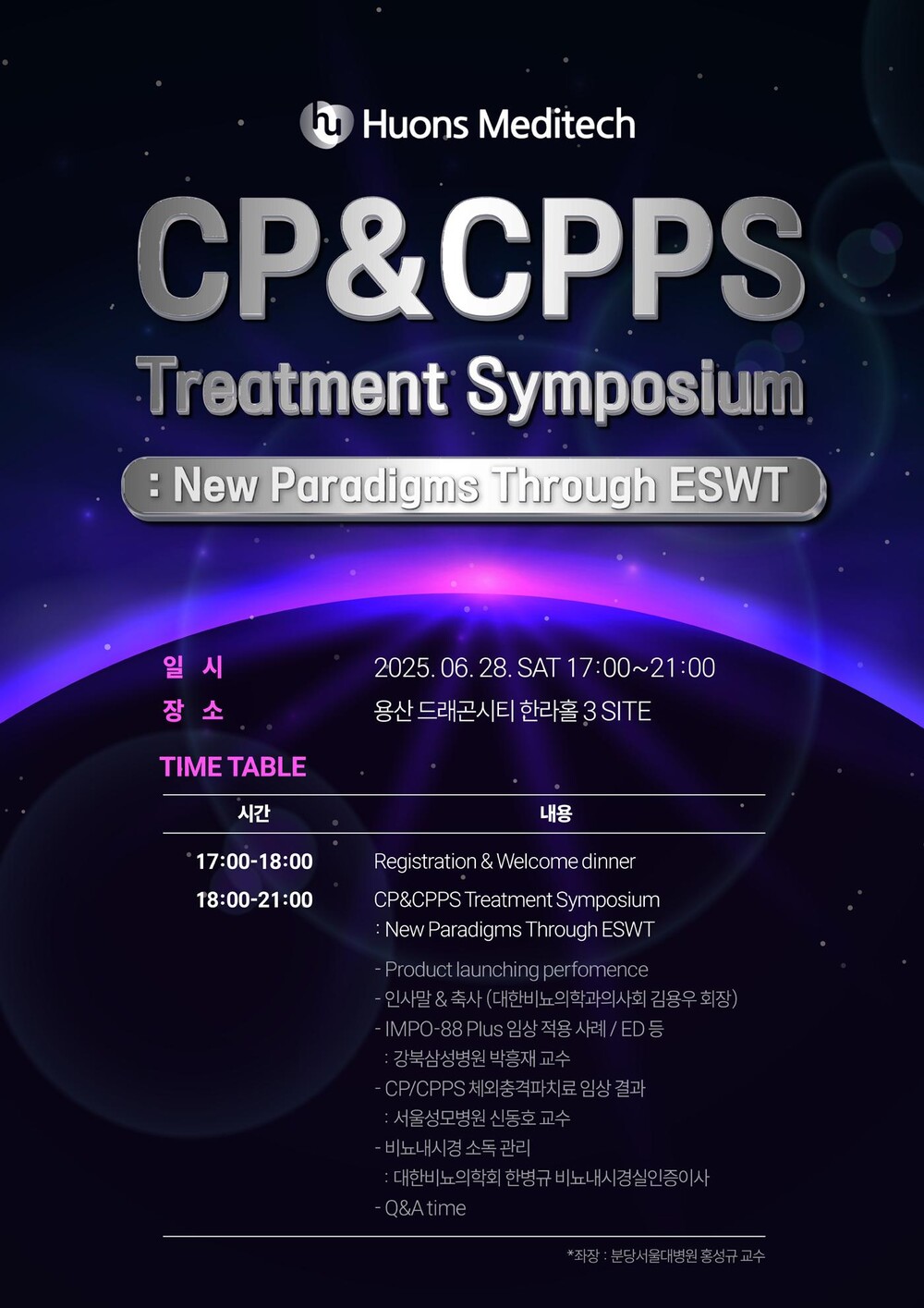 휴온스메디텍(대표 이진석)은 비뇨기 체외충격파 치료기 시술 사례 중심의 학술행사인 '만성전립선염&만성골반통증증후군 치료 심포지엄'(CP&CPPS Treatment Symposium)을 오는 28일 서울 용산 서울드래곤시티에서 개최한다고 24일 밝혔다.