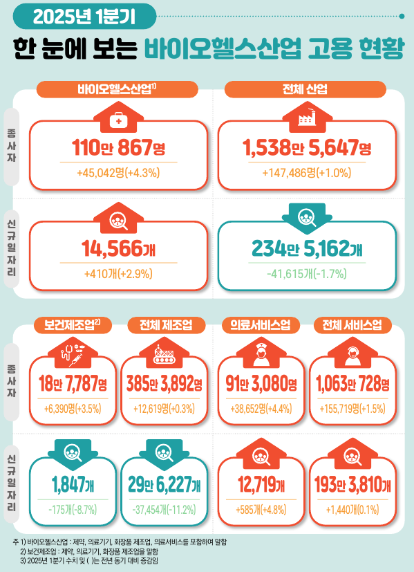 27일 한국보건산업진흥원(원장 차순도, 이하 진흥원)이 발표한 '2025년 1/4분기 바이오헬스산업 고용동향'에 따르면, 올해 1분기 바이오헬스산업 종사자 수는 총 110만1000명으로 집계됐다. 이는 전년 동기 대비 4만5000명 증가한 수치로, 전 산업 평균 대비 3.3%p 높다.