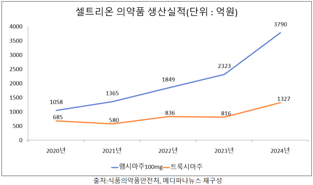 원료의약품도 셀트리온 의약품 생산실적이 증가하는 데 일조했다. 정부 자료에 따르면, '램시마피하주사원액'과 '램시마원액' 생산실적 합계는 2022년 6442억원에서 지난해 1조647억원으로 65.3%(4205억원) 증가했다.