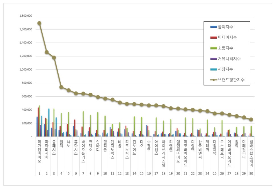 의료기기 상장기업 브랜드평판 1위를 기록한 리가켐바이오 브랜드는 참여지수 300,764 미디어지수 437,088 소통지수 468,089 커뮤니티지수 171,177 시장지수 315,603이 되면서 브랜드평판지수 1,692,722로 분석됐다. 지난 5월 브랜드평판지수 1,744,725와 비교해보면 2.98% 하락했다.