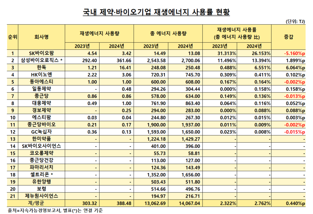 이 회사들이 재생에너지 전환을 준비하지 않는 건 아니다. HK이노엔은 2021년부터 충청북도 청주시 오송읍 사업장에 523kW 태양광 발전 시스템을 설치했으며, 지난해 경기도 성남시 판교 연구소에 44kW 태양광 발전 설비를 구축한 바 있다.