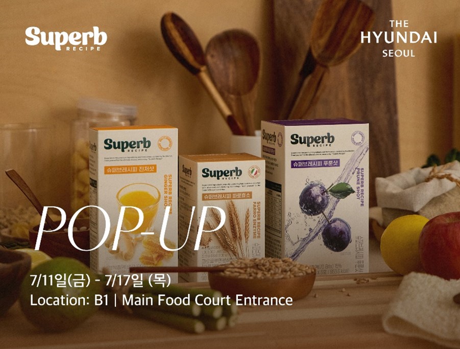 웰니스 라이프스타일 브랜드 슈퍼브레시피는 더현대서울 지하 1층 식품관 메인 공간에서 팝업스토어를 운영한다. 이번 팝업에서는 브랜드의 대표 제품인 '슈퍼브레시피 진저샷'을 비롯해 신제품 '슈퍼브레시피 푸룬샷', '슈퍼브레시피 파로효소' 등 다양한 건강 식품을 체험하고 구매할 수 있다.
