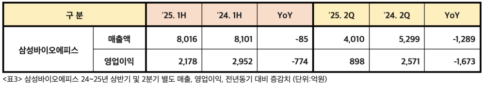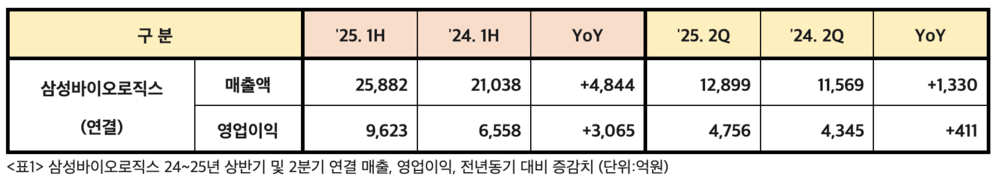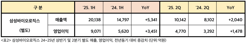 삼성바이오로직스의 2분기 별도 기준 매출은 1조142억원, 영업이익은 4770억원으로 각각 전년 동기 대비 2040억원, 1478억원 증가했다. 이는 1~3공장과 2022년 10월 부분 가동을 실시했던 4공장 6만L 규모 설비의 안정적인 풀가동 및 4공장 18만L 규모 설비의 조기 램프업 영향이다.