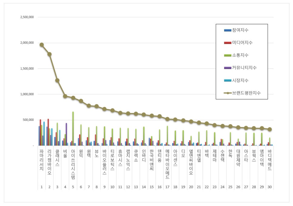 2위, 리가켐바이오 브랜드는 참여지수 370,206 미디어지수 525,458 소통지수 340,362 커뮤니티지수 210,871 시장지수 336,068이 되면서 브랜드평판지수 1,782,964로 분석됐다. 지난 6월 브랜드평판지수 1,692,722와 비교해보면 5.33% 상승했다.