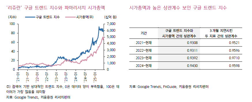 실제로도 리쥬란 구글 트렌드 지수와 파마리서치 시가총액은 높은 상관계수를 보여 왔다.