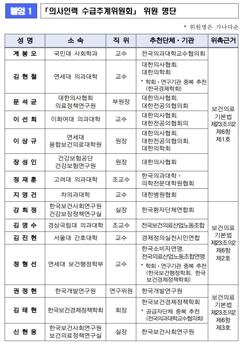 복지부는 그간 의사인력 수급추계위원회를 구성하기 위해 보건의료 공급자단체, 수요자단체, 학회·연구기관 등 21개 관련 단체·기관으로부터 다양한 전문가를 추천받았으며, 이 중 전문성 등을 고려해 15명의 위원을 위촉했다.