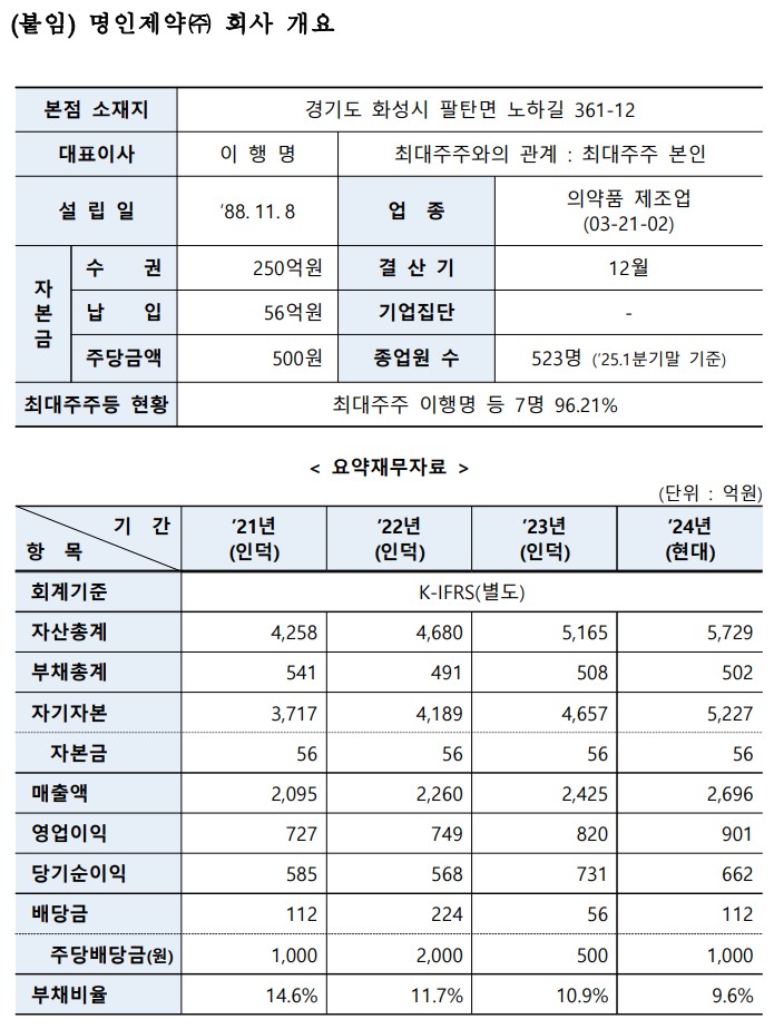 명인제약은 1988년 11월 설립돼 각종 전문의약품 및 일반의약품 제조·판매 사업을 영위하고 있다.