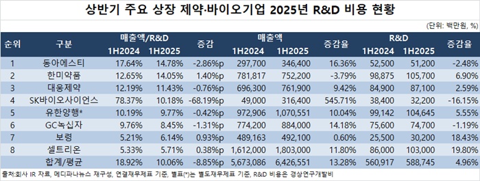이날 기준 국내 매출 상위권 상장 제약·바이오 기업 가운데 IR 자료를 통해 경상연구개발비를 공개한 회사는 8곳이다.