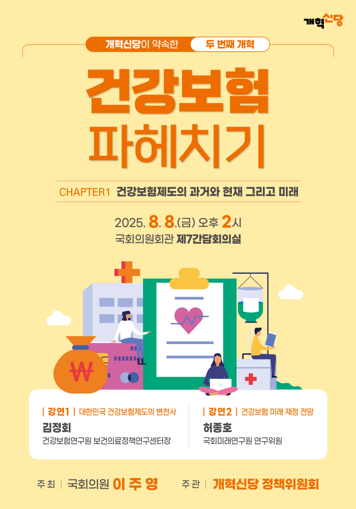 이에 이번 세미나에서는 국민건강보험공단 건강보험연구원의 김정회 보건의료정책연구센터장이 '대한민국 건강보험제도의 변천사'를 주제로 강연하고, 이어서 국회미래연구원 허종호 연구위원이 '건강보험 재정 전망'이라는 제목으로 강연을 진행할 예정이다.