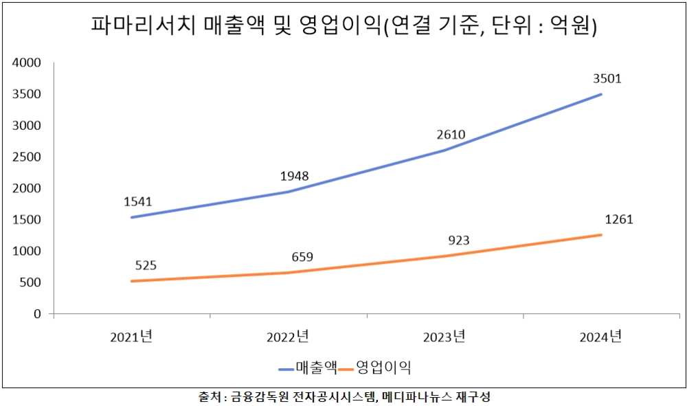 파마리서치 주가 상승 배경엔 실적(연결 재무제표) 확대가 있다. 이 회사 매출액은 2021년 1541억원에서 2022년 1948억원으로 26.4% 증가한 데 이어 2023년(2610억원)에 34% 늘었다. 지난해 매출액은 3501억원으로, 전년 대비 34.1% 증가했다.