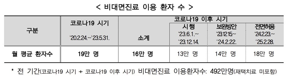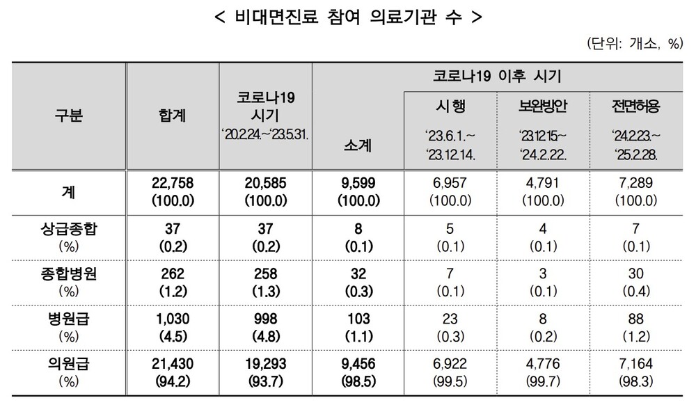 정부가 공개한 비대면진료 시범사업 의료기관 청구자료 분석 결과에 따르면, 2020년 2월부터 올해 2월까지 5년 동안 한 번이라도 비대면진료를 시행한 의료기관은 약 2.3만개소였고, 국민 492만명이 비대면진료를 이용했다. 종별 참여 현황을 보면 98~99%가 의원급 의료기관이었다.